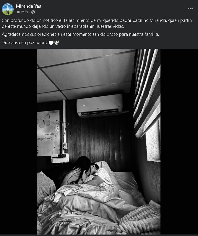 “Con profundo dolor, notifico el fallecimiento de mi querido padre, Catalino Miranda, quien partió de este mundo dejando un vacío irreparable en nuestras vidas.”